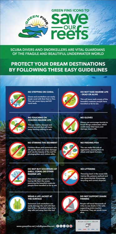 Scuba divers and snorkellers are guardians of our beautiful oceans. You can give customers a higher quality of experience by encouraging them to book with Green Fins members. For instance, you can share these easy Green Fins guidelines with customers before they even go away: